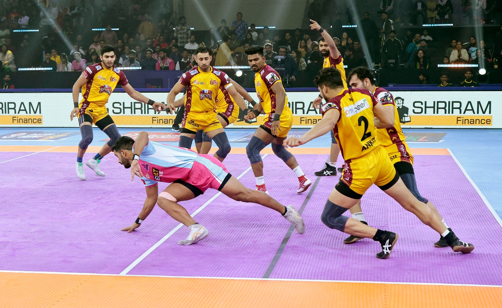 The Jaipur Pink Panthers produced a scintillating display of kabaddi on Saturday, at the Noida Indoor Stadium in PKL Season 11. The Jaipur Pink Panthers, who trailed for most of the first half, stormed back into the game to pick a 41-28 win against the Telugu Titans. During the course of the game, Jaipur Pink Panthers’ Arjun Deshwal achieved the 1100 raid point mark, while also registering a Super 10, along with Neeraj Narwal. For the Telugu Titans, Vijay Malik finished with 17 points to his name.