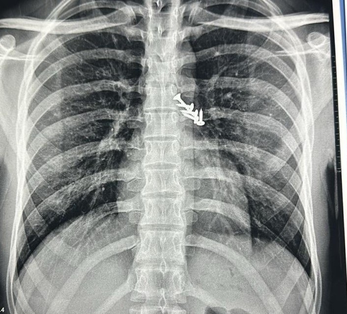 Upon regaining consciousness, the patient experienced a severe bout of coughing lasting 2-3 minutes, followed by persistent cough and chest pain. Diagnostic imaging, including a chest X-ray and plain X-ray of the abdomen, revealed the presence of five screws lodged in the lungs and two screws in the abdomen. Fortunately, screws had not caused any significant tears in the airway.