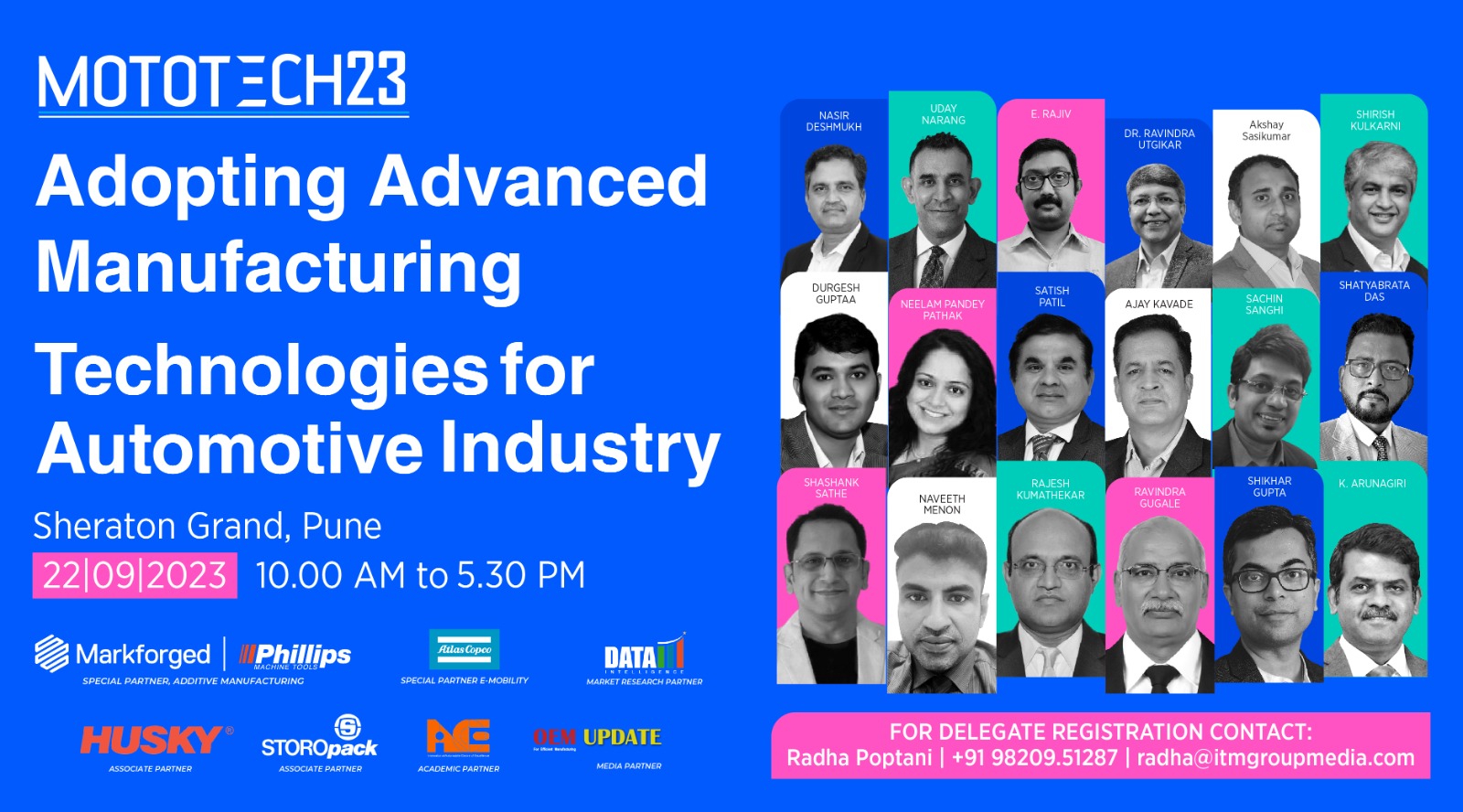 MOTOTECH 2023 offers sponsorships and speaking opportunities for interested parties. For sponsorship, one can contact +91 88260.68345 or email sudhanshu@itmgroupmedia.com . Contact Sagar Tamhane at +91 98206.92293 to explore speaking opportunities or email sagar@itmgroupmedia.com . For delegate participation, contact Radha Poptani at +91 98209.51287 or email radha@itmgroupmedia.com .
