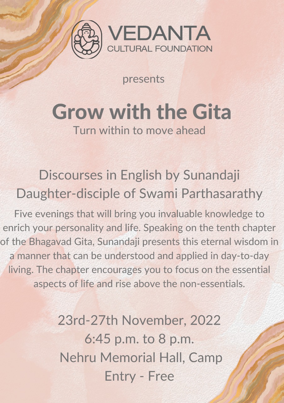 Home Happenings Vedanta Cultural Foundation presents Grow With Gita Happenings Vedanta Cultural Foundation presents Grow With Gita By Sanjay Jadhav - November 14, 2022 Facebook Twitter Pinterest WhatsApp Linkedin ReddIt Tumblr Telegram EVENT LISTING A 5-day enlightening programme hosted by Vedanta Cultural Foundation that will guide audiences in interpreting the Bhagavad Gita’s tenth chapter.