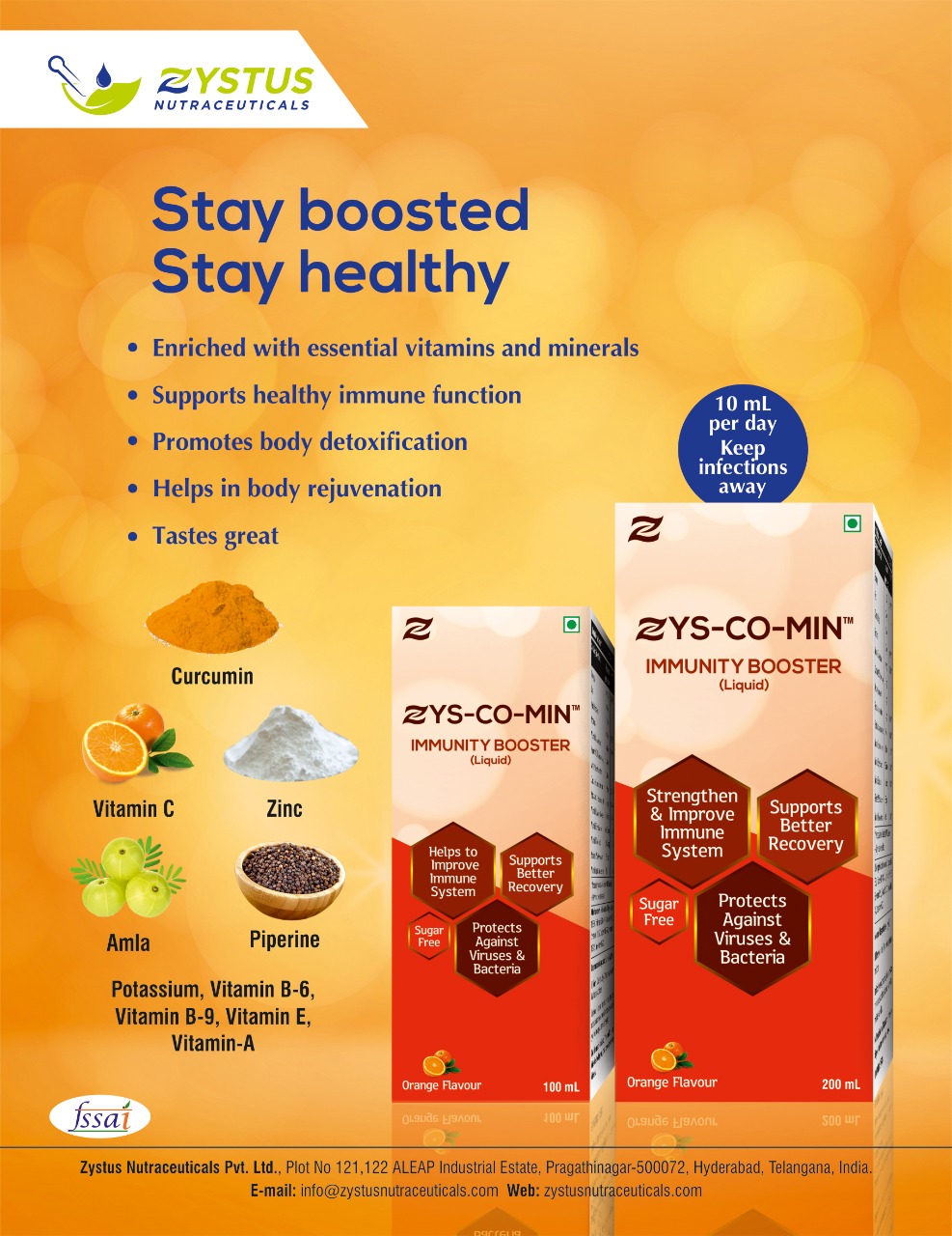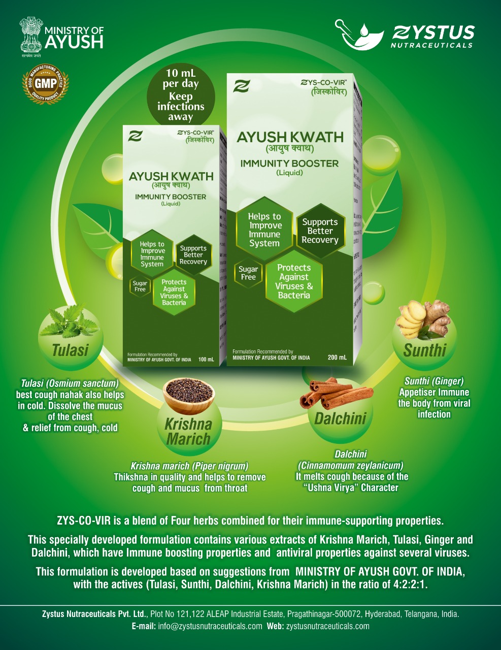 Hyderabad-based healthcare company Zystus Nutraceuticals, is launching its immunity boosters called Zys-Co-Vir™ and Zys-Co-Min™. Zys-Co-Vir has been formulated on a recommendation by India’s Ministry of Ayurveda, Yoga & Naturopathy, Unani, Siddha and Homoeopathy (AYUSH). It was initially developed as “Ayush Kwath” as suggested by the AYUSH Ministry to boost immunity against Covid-19.