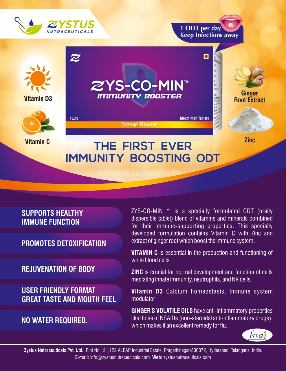 Unlike other vitamin C and multivitamin tablets, Zys-Co-Min tablets have a combination of vitamins, minerals and herbs, containing vitamin C and D3, zinc, and ginger extract. The liquid formulation contains vitamin C, Vitamin B, zinc, amla, piperine, and curcumin. The Zys-Co-Vir (Ayush Kwath) tablet and suspension contain a composition of tulsi, sunthi, dalchini, and krishna marich in a ratio of 4:2:2:1, in keeping with the Ministry of AYUSH’s recommendations.